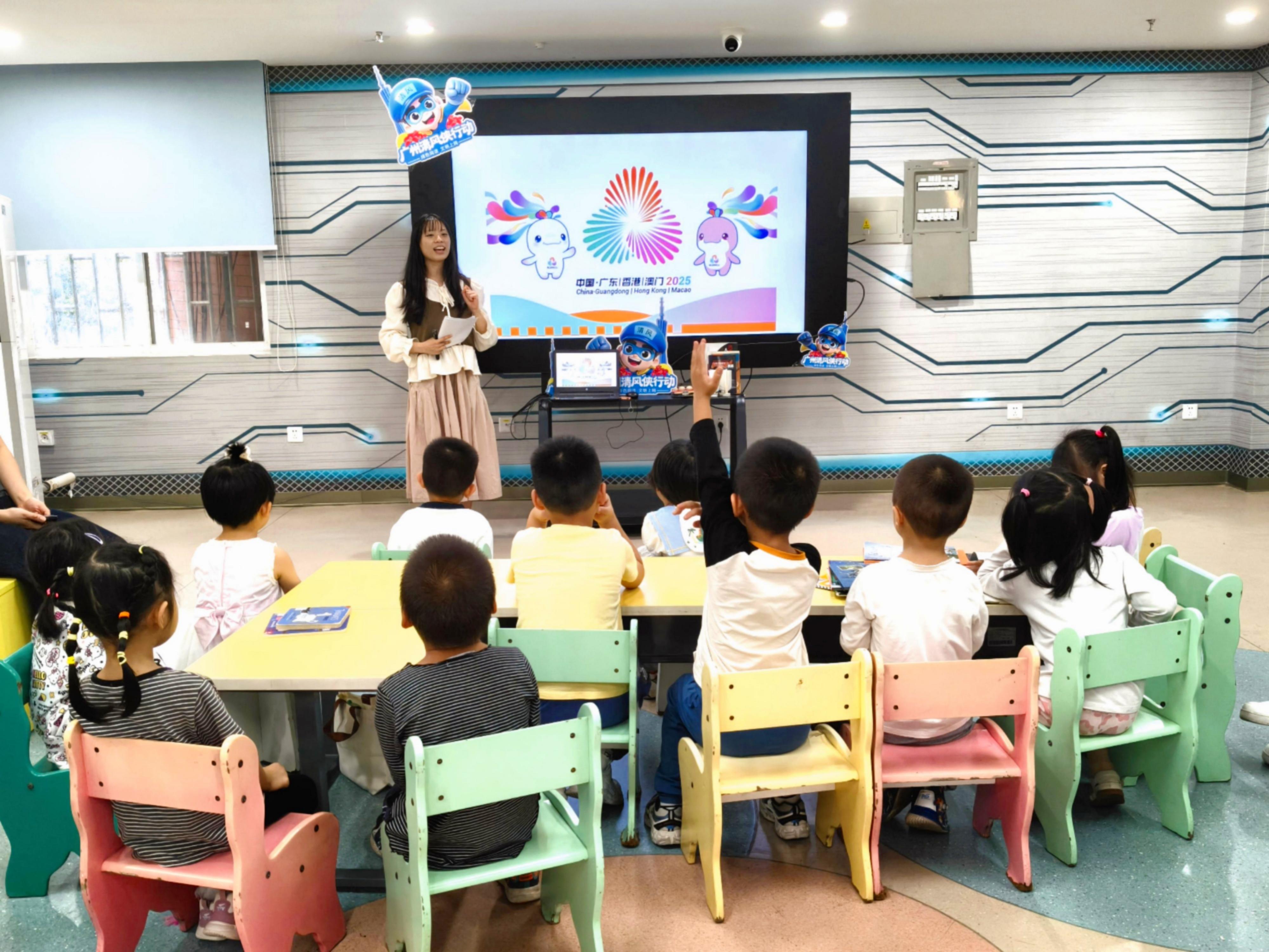 在广州市“扫黄打非”办公室、广州市文化广电旅游局、越秀区“扫黄打非”办公室的指导下,为深化“清风侠”护苗行动,引导少年儿童阅读健康好书、悦享健康生活,2025年11月8日,在第十五届全运会开幕前夕,越秀区图书馆在三楼绘本馆精心策划了一场别开生面的“绿色阅读+亲子运动”融合活动。
