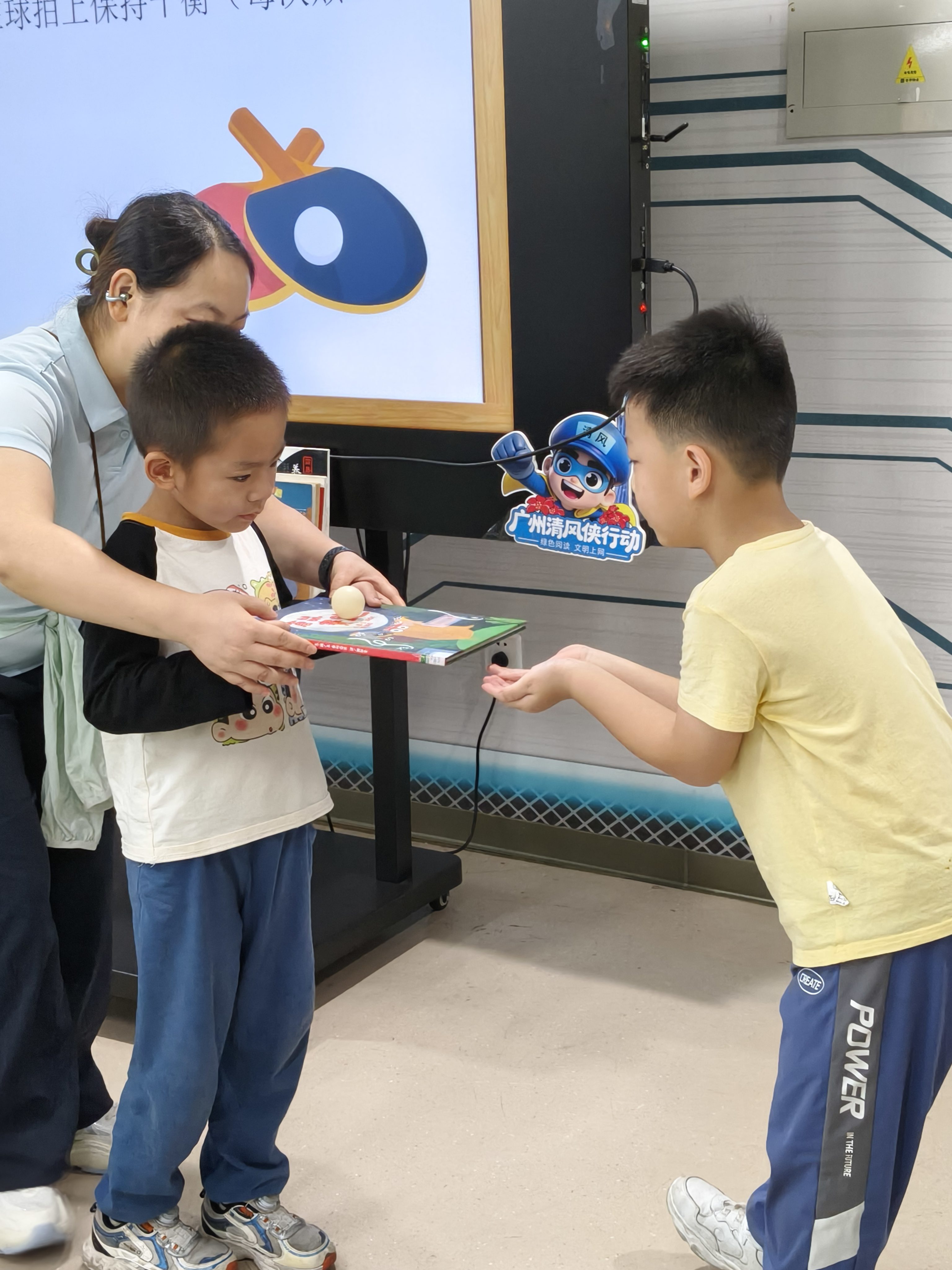 在悠扬的“清风侠”护苗主题曲旋律中,活动正式拉开帷幕。悦耳的歌声如春风化雨,不仅瞬间点燃了现场的氛围,更将“护苗·绿色阅读”的理念如种子般悄然播撒在每一位读者心田。随后,馆员以充满趣味性的讲解,介绍了太极拳、八段锦、踢毽子和乒乓球四项运动的技巧与规则,并为大家现场展示了毽子、乒乓球,生动形象的讲述引发了小朋友们浓厚的兴趣与积极参与的热情。