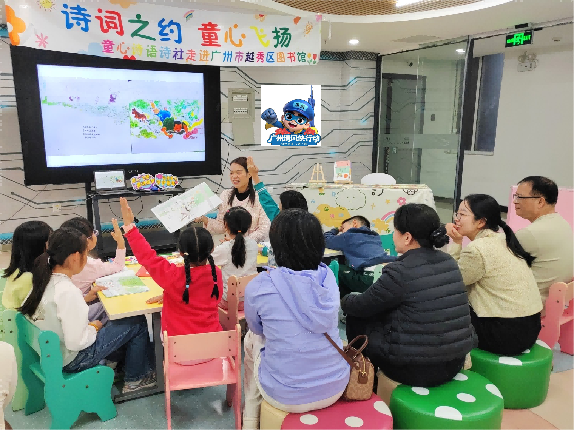 在广州市“扫黄打非”办公室、广州市文化广电旅游局、越秀区“扫黄打非”办公室的指导下,11月29日下午,越秀区图书馆、越秀区铁一小学童心诗语诗社联合举办了“清风侠”趣课堂之“诗词之约 童心飞扬”阅读推广活动,受到小朋友和家长的热烈欢迎。