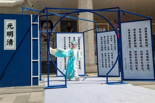 步入元明清的“线装书世界”,简约的蓝白配色勾勒出传统文化的典雅。徐贲《登广州城楼》、陈献章《浴日亭次东坡韵》、王渐逵《登白云第一峰》等文学名篇吸引市民读者细细品读,现场还上演了《牡丹亭》“皂罗袍”经典片段,用昆曲、粤曲的形式让经典穿越时空。