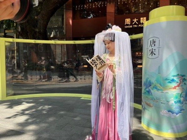 “梦回”唐宋时,唐诗宋词,代表了中国文学史的辉煌成就。“江上粤王台,登高望几回”“见花辞涨海,避雪到罗浮”……由卷轴组成的文化长廊上,书写着唐宋时期《与王六履震广州津亭晓望》《三月晦日游越王台二首(其一)》等名篇佳作。活动现场,琵琶、古筝、二胡演奏随书法表演而缓缓流淌,邀请市民读者共赴诗意盛会。