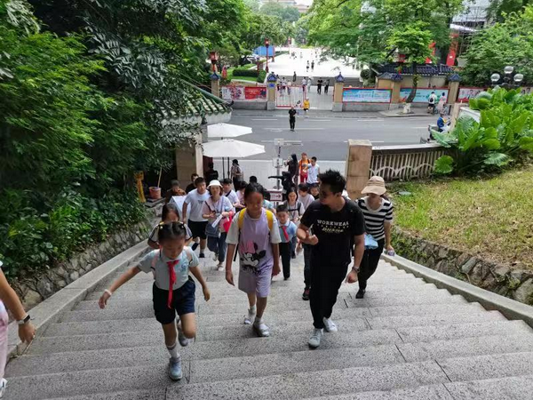 随后,大家跟随专业讲解员在中山纪念堂内观看展览,深入了解孙中山先生的生平事迹,重温中国民主革命的历程。怀着依依不舍的心情离开中山纪念堂后,小读者踏上了越秀山极速通道百步梯(实际有498个阶梯),向中山纪念碑走去。经过位于越井岗南麓半山腰的“孙先生读书治事处”纪念碑,大家了解了1922年总统府62名卫士与陈炯明叛军浴血奋战的故事。活动的最后一站就是位于越秀山498级阶梯之上的中山纪念碑。小读者怀着崇敬之心瞻仰庄严肃穆的中山纪念碑,缅怀中国民主革命的先行者。