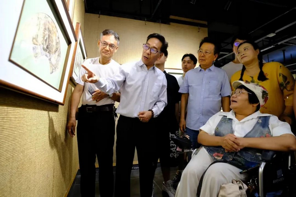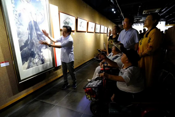 展览开幕式当天,几位热爱艺术、热爱写作的残障读者开着轮椅车,来到越秀区图书馆参观展览。五位画家为他们讲解个人作品的创作立意、文化内涵等,残障朋友们在现场也认真聆听,兴味十足,让展览现场成为了一场温暖人心的艺术盛宴。