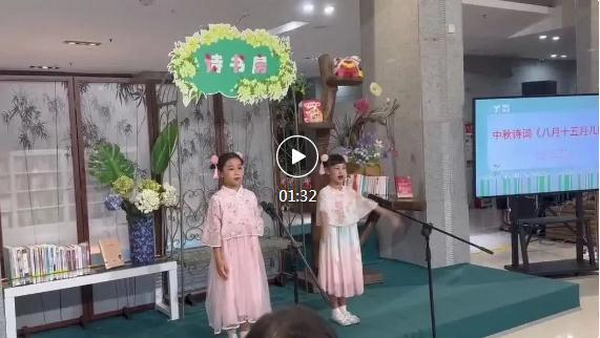 月亮是中秋节最独特的象征,赏月更是一个家庭团聚的重要活动。二年3班的徐均灵、石悦熹两位同学一起朗诵中秋诗词《八月十五月儿圆》。
