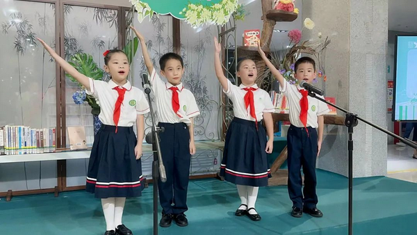二年3班的林筱芮、林煜皓、胡雅茹、吴宏昭同学集体朗诵红色经典《童心向党 我爱祖国》,带领大家回到那个激情澎湃的时代,再次感受到革命烈火的伟大力量。