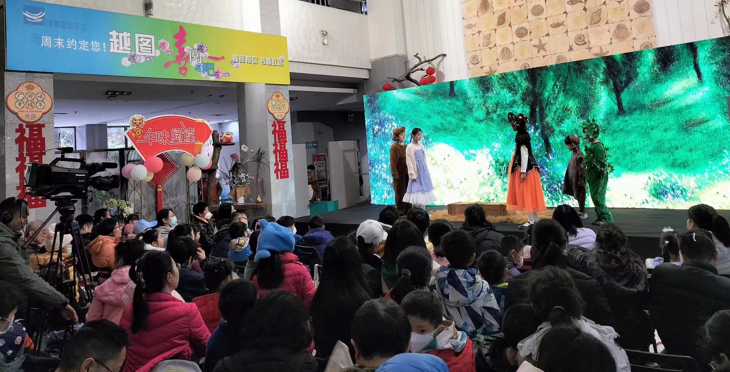 在越秀区图书馆“喜阅舞台”上,来自开心麻花儿童剧团广州站的小演员们正生动演绎着经典奇幻冒险儿童剧《绿野仙踪》。