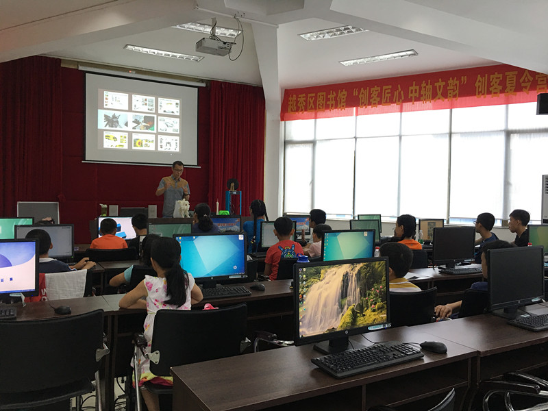 2018年7月28日,由越秀区文化广电新闻出版局主办,越秀区图书馆承办的“行走?阅图”第七季“创客匠心 中轴文韵”创客夏令营正式拉开帷幕。活动邀请广州市粤语讲古代表性传承人彭嘉志带领读者游览广州传统中轴线部分景点,分享《童说岭南——听彭嘉志讲古仔:小脚走古迹》中的有趣古仔;参观完广州传统中轴线重要景点,读者们进行为期4天3D培训与设计创作,将游览中获得的灵感注入3D作品的创作中,DIY出属于自己的独一无二的中轴线3D作品。阅读+导赏+创作,让读者将阅读收获的知识活化利用,在创作中让传统文化与新兴科技碰撞出绚丽火花,让读者增强创新能力。