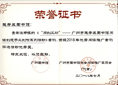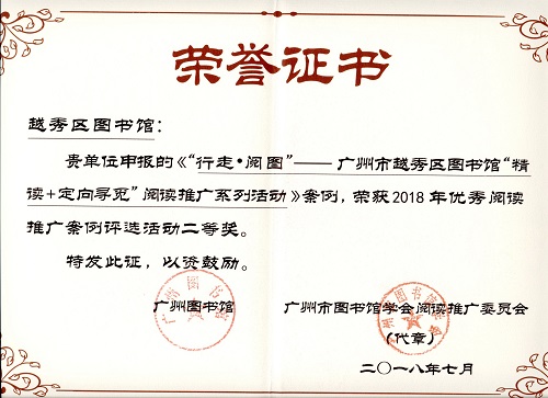 日前,广州市越秀区图书馆接获喜讯:该馆的三个阅读推广案例荣获广州市2018年优秀阅读推广案例评选活动二等奖1项,优秀奖2项,荣誉由广州图书馆和广州市图书馆学会阅读推广委员会授予。全市共评选出一等奖2个、二等奖4个、三等奖6个、优秀奖9个。