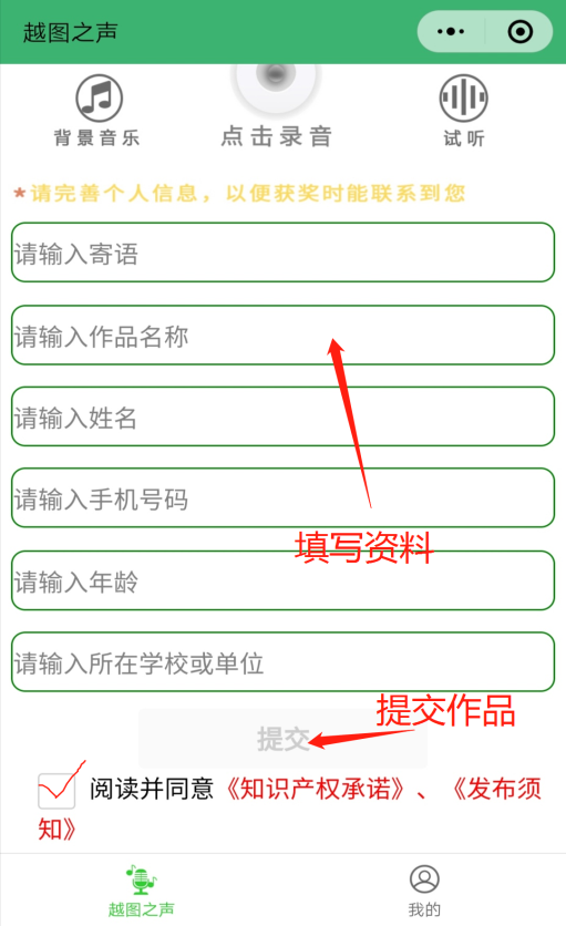 3、填写作品名称、姓名、手机号码等资料,勾选阅读并同意《知识产权承诺》、《发布须知》,然后点击“提交”即可。