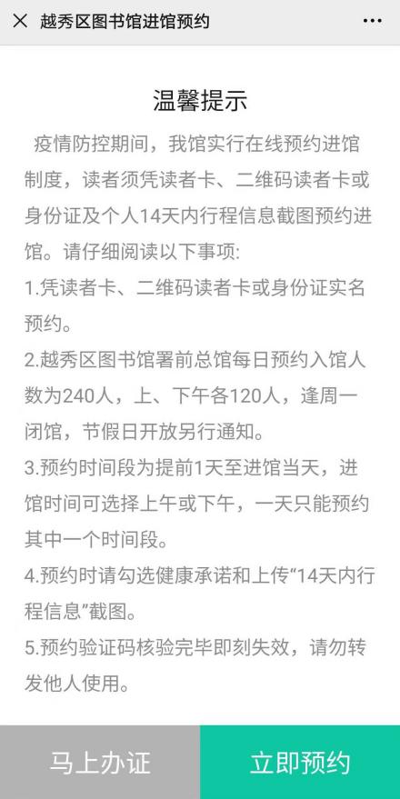 1、预约及进馆须为持证本人,读者进馆时,须在入口处接受体温测量,凭本人读者卡、二维码读者卡或身份证原件进行实名验证,并现场提供穗康码(或粤康码)、预约码,进行健康通行登记后方可入馆。
