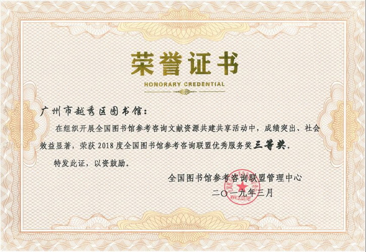 越秀区图书馆在2019年有半年以上时间闭馆维修的情况下,坚持服务不打烊,总分馆接待读者180万多人次,外借书刊61万多册次,组织和指导街道分馆开展阅读推广惠民活动2200多场、参与人次超50万人次;加入“全国图书馆参考咨询联盟”平台,通过互联网共回复43903项咨询,传递中文期刊论文31941篇、中文学位论文11807篇、中文会议论文、中文专利等155篇;做到在包括各省市级公共图书馆、高校图书馆和科技图书馆的全国图书馆参考咨询联盟360多家成员中排名2019年同期的第14位;在近600名的咨询馆员中排名第11位。荣获2018年度全国图书馆参考咨询联盟优秀服务奖三等奖,光塔分馆被广州图书馆评为“最美基层图书馆”,“一街一品牌”阅读圈获得广东图书馆学会2019年阅读推广案例大赛二等奖。