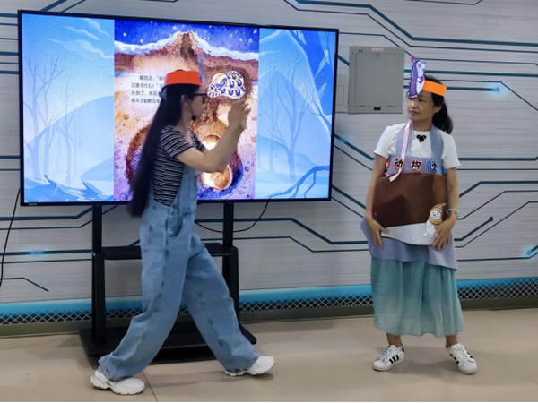 朱老师和谷老师穿上故事衣,为大家生动形象地讲述小鼹鼠过冬找食物的故事。
