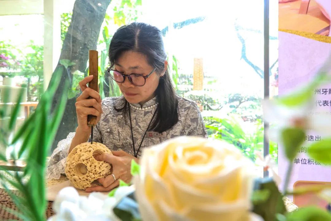 兰圃化身广府非遗传承大舞台,广州牙雕、象牙微雕、素馨花传说、古琴艺术(岭南派)、通草画、广州榄雕、广绣、董氏奇穴针法、蒸馏酒传统调味技艺等非遗项目汇聚,通过“展、演、创、传”联动,为群众奉上一场可触、可感、可传的广府文化沉浸式非遗盛宴。5天共吸引进园人数超1.5万人次,较平日入园人数增长130%,带动园内文创商品营业额达3.5万元。
