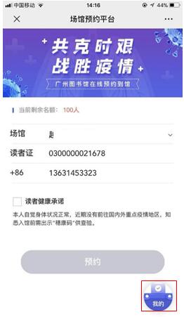 选择要预约的场馆(请选越秀区图书馆署前总馆);输入读者证号;输入手机号码并验证;根据自身情况,勾选健康承诺。点击“预约”进入下一步。