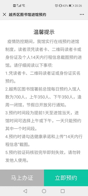 1、预约及进馆须为持证本人,读者进馆时,须在入口处接受体温测量,凭本人读者证、二维码读者证或身份证原件进行实名验证,并现场提供穗康码(或粤康码)、预约码,进行健康通行登记后方可入馆。