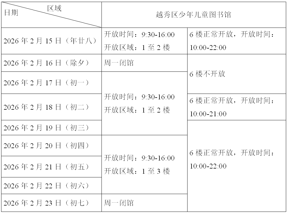 2026年春节假期期间,越秀区图书馆和越秀区少年儿童图书馆开放服务有关事项安排如下:
