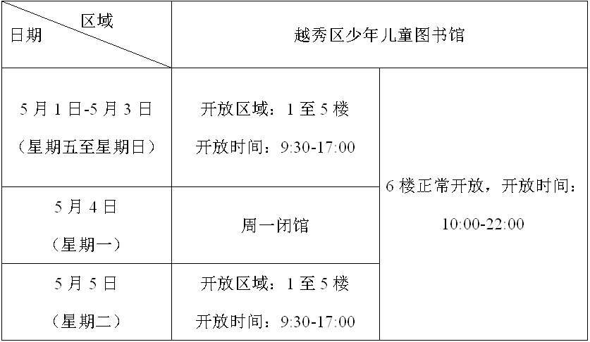2026年五一劳动节假期期间,越秀区图书馆和越秀区少年儿童图书馆开放服务有关事项安排如下: