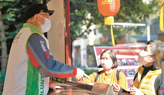 志愿者驿站里,甘永乐正在为前来询问路线的游客提供服务