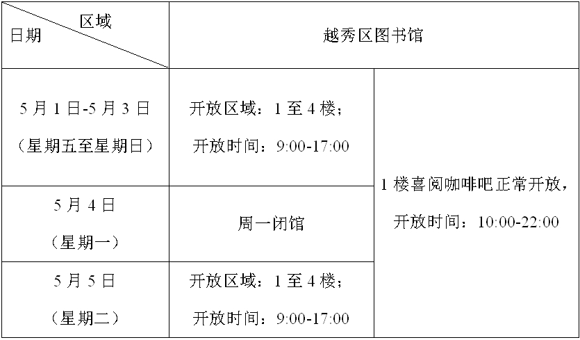 2026年五一劳动节假期期间,越秀区图书馆和越秀区少年儿童图书馆开放服务有关事项安排如下: